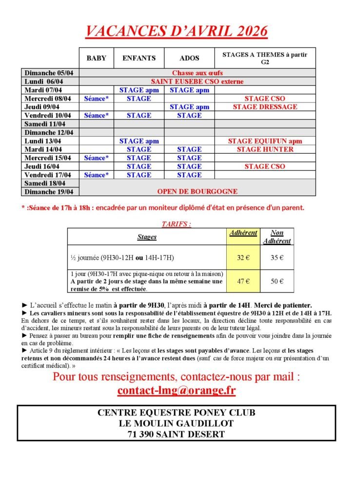 Pendant toutes les vacances scolaires, la structure vous accueille pour effectuer des stages, adaptés à votre niveau. Différentes formules sont possibles: en demi-journée ou sur la journée complète.